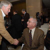 John Kitzhaber, Oregon's governor from 1995 to 2003 and present, shakes hands with Victor Atiyeh during Governor Theodore Kulongoski's photo dedication in the Oregon capitol building. Sitting next to Atiyeh is Barbara Roberts, who was Oregon's governor from 1991 to 1995. This is one of a set of photographs taken by Gerry Lewin, a photographer for the Salem Statesman Journal.