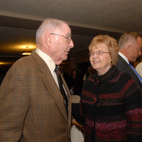 Victor Atiyeh and Barbara Roberts (governor from 1991 to 1995) during Theodore Kulongoski's photo dedication in the Oregon capitol building. Kulongoski was governor from 2003 to 2011. This is one of a set of photographs taken by Gerry Lewin, a photographer for the Salem Statesman Journal.