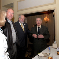 - Denny Miles, Victor Atiyeh's former press secretary, standing next to his old boss during a staff reunion. This is one of a set of photographs taken by Gerry Lewin, a photographer for the Salem Statesman Journal.