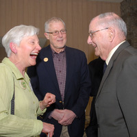 - Governor Victor Atiyeh chatting with two unidentified people at a reunion for his staff. This is one of a set of photographs taken by Gerry Lewin, a photographer for the Salem Statesman Journal.