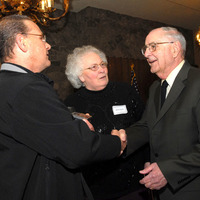 - Victor Atiyeh greets Ruby Lewis, his former administrative assistant, and an unidentified man at a reunion for his staff. This is one of a set of photographs taken by Gerry Lewin, a photographer for the Salem Statesman Journal.