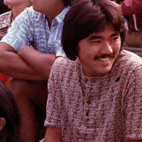 Pacific University students sitting outdoors, possibly at the kalua pig roast at one of Pacific University's annual Lu'aus, likely between 1976-1982.