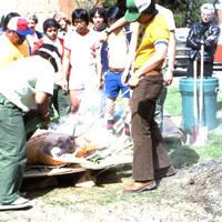 Students and family members from Hawaii roasting a pig for the 1976 Lu'au at Pacific University.
