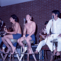 A group of male students, some of whom are holding guitars, preparing to sing for one of Pacific University's annual Lu'aus. This photograph was likely taken circa 1972-1973. This photograph may have been taken during a rehearsal, a few hours before the actual Lu'au performance.