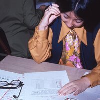 Linda Endo, a Pacific University student (Class of 1973), circa 1972 or 1973. She has several documents on the table in front of her, and appears to be working on grading. This photograph may have been taken at the university's annual Lu'au or at another event hosted by the Hawaiian Club.