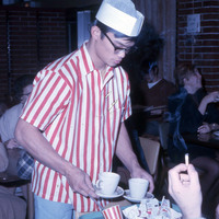 A student wearing a red striped uniform and white paper cap, serving what appears to be the families of students. This photograph might have been taken in Washburn Hall, possibly during Parents Weekend, circa 1972-1973.