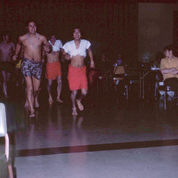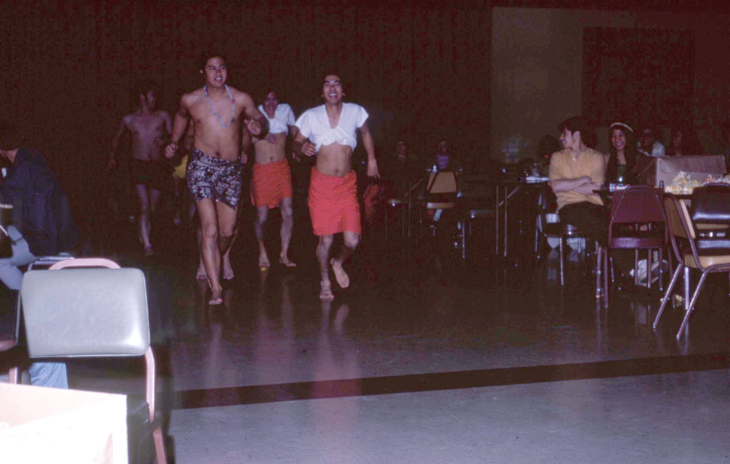Pacific University students walking towards a performance, possibly at the annual Lu'au between 1971-1973. Two of the students are identified on the original slide as: Glenn Ginoza (Class of 1973) and Richard Hare. The original slide is dark and underexposed.
