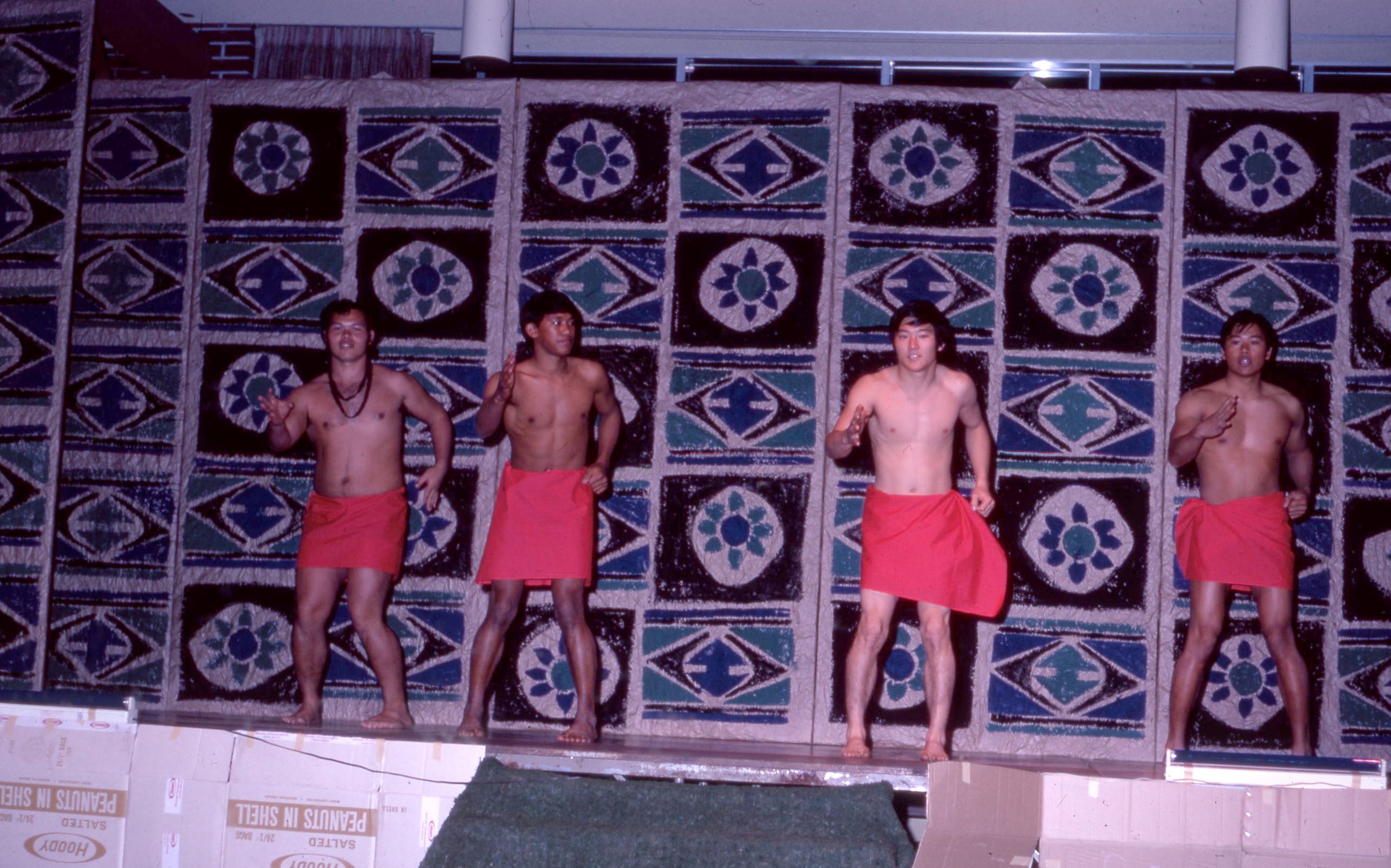 Four male dancers wearing red malo at Pacific University's annual Lu'au, probably between 1971-1973. They are identified on the original slide from left to right as students and alumni Mike Ben (Class of 1971), John Saplan (Class of 1973), Nathan Kurisu (Class of 1972) and Flor Matias (Class of 1972). This may have been at a rehearsal: the cardboard paper at the base of the stage would be covered with greenery and flowers during the actual performance.