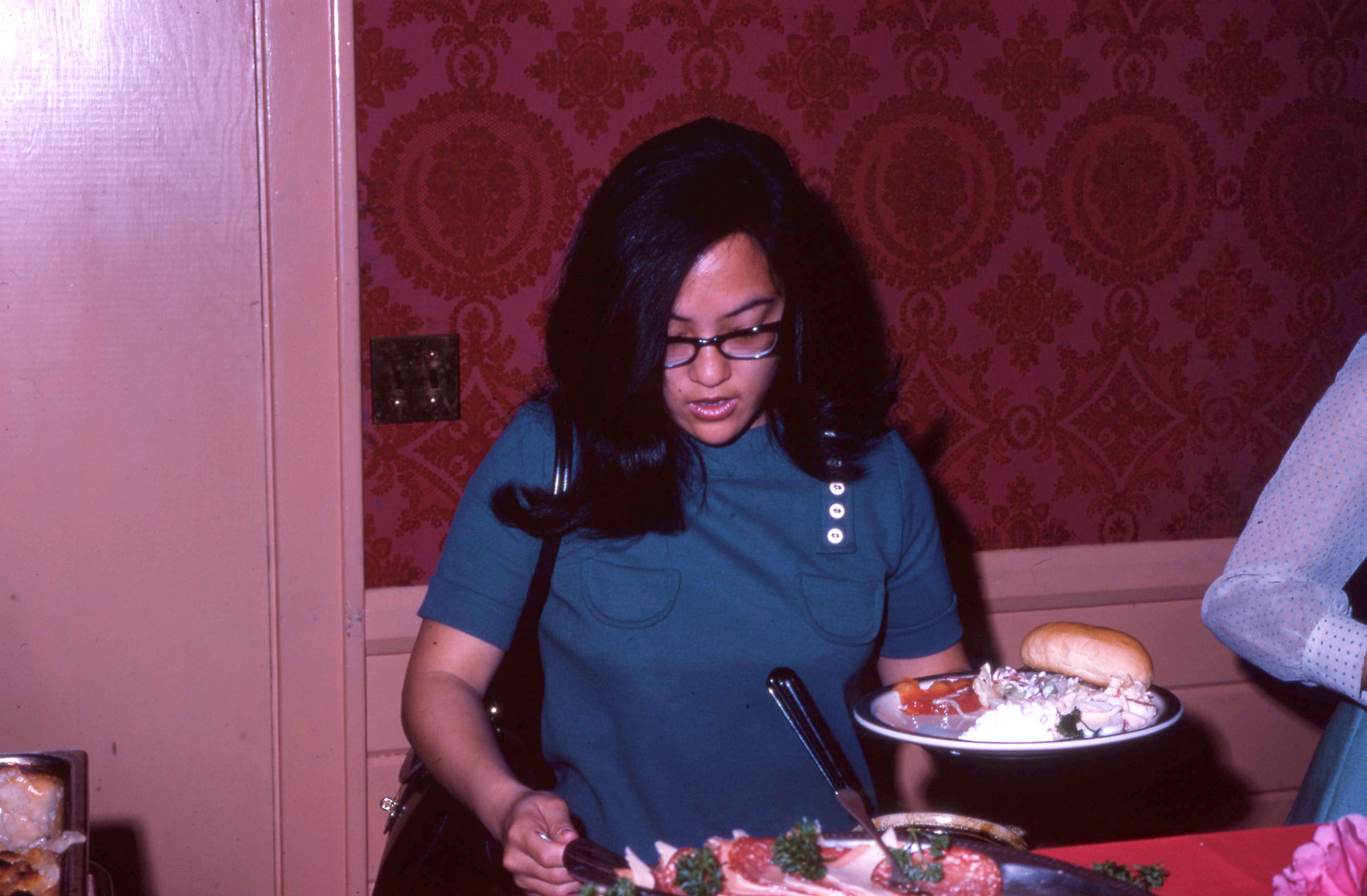 Pacific University student Marylee Moon (Class of 1970) getting food at a buffet line, possibly at an event hosted by Pacific University's Haumana O Hawai'i (Hawaiian Club) circa 1970-1973.