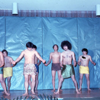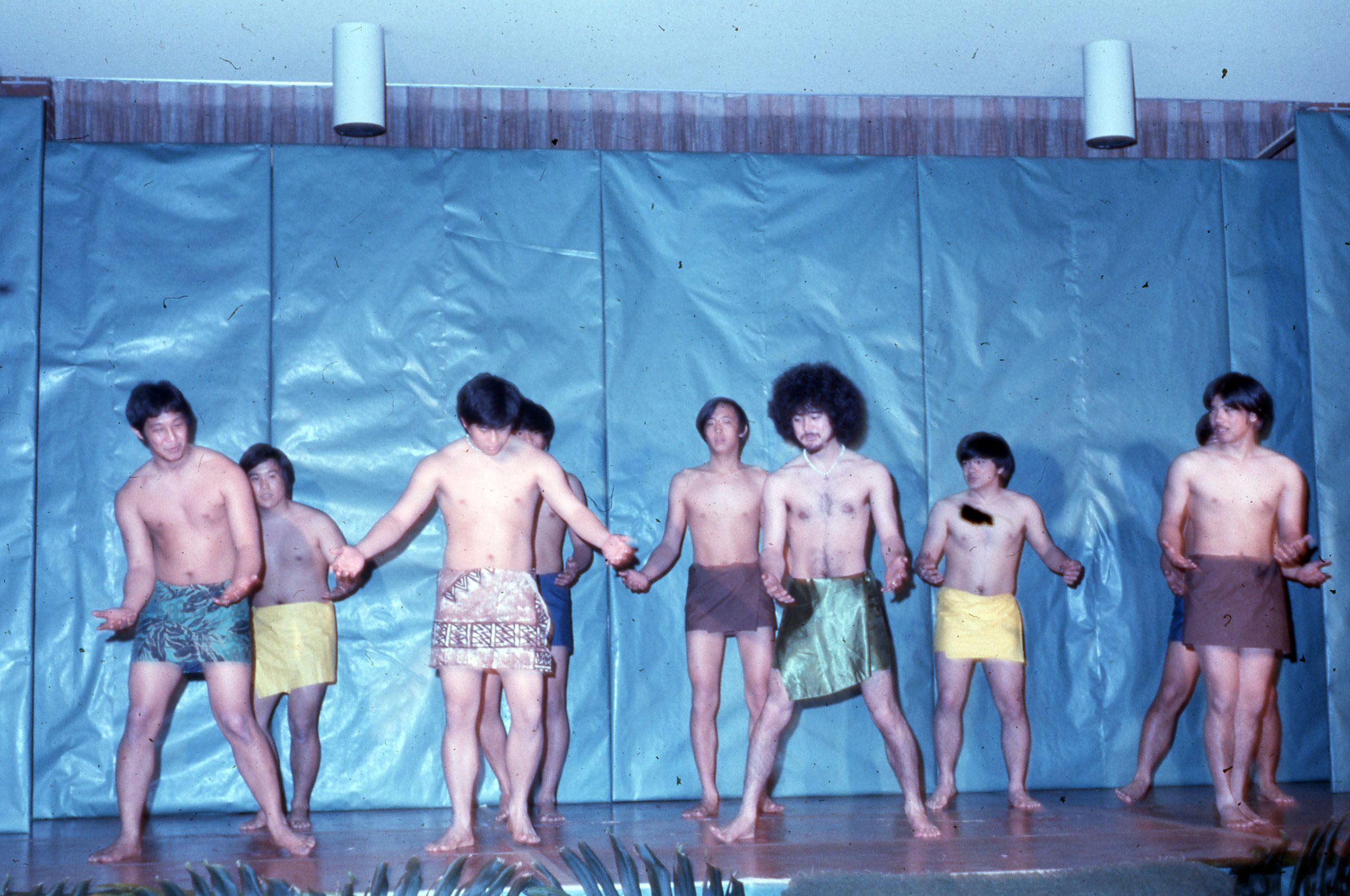 Male dancers, performing in malo on stage. This took probably place at Pacific University's annual Lu'au circa 1970. The picture may have been taken at a rehearsal or other event, as none of the performers are wearing the leis that were typical of the main Lu'au performance. It is also possible that it was taken during an alternate Fall dance performance hosted by Haumana O Hawai'i (Hawaiian Club).