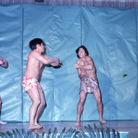 Male dancers, performing in malo on stage. This took probably place at Pacific University's annual Lu'au circa 1970. The picture may have been taken at a rehearsal or other event, as none of the performers are wearing the leis that were typical of the main Lu'au performance. It is also possible that it was taken during an alternate Fall dance performance hosted by Haumana O Hawai'i (Hawaiian Club).