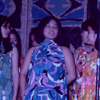 A group of Pacific University women students on stage at the university's annual Lu'au, probably in 1971. Two of them are identified on the original slide as: Sue Arisumi (Class of 1971) and Mary Aoki. The image is dark and underexposed.