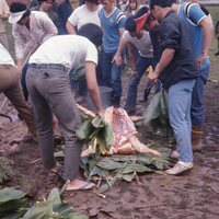 A group of students preparing a kalua pig roast at Pacific University's annual Lu'au, while others observe. This photograph was probably taken around 1971.