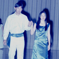Pacific University students Russell Onuma (Class of 1972) and Jill Matsui (Class of 1972) performing at the university's annual Lu'au, probably in 1971. They appear to be dressed as attendants of the "Royal Court" of the event.