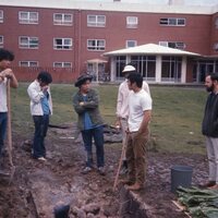 A group of students tend the kalua pig roasting pit at Pacific University's annual Lu'au, probably in 1971. Clark Hall appears in the background. Hot coals and banana or ti leaves are visible in the foreground.