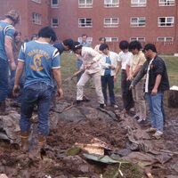 A group of students tend the kalua pig roasting pit at Pacific University's annual Lu'au, probably in 1971. Clark Hall appears in the background. Hot coals and banana or ti leaves are visible in the foreground. Two students are wearing "Menehunes" t-shirts, possibly from Maunalua High School in Honolulu.