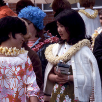 A group of women students wearing leis and Hawaiian clothing, standing outside of Pacific University's annual Lu'au celebration. One is holding a camera. This photograph was likely taken in 1969 or 1970.