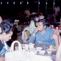 A group of people, most of whom were probably Pacific University students, eating dinner at the university's annual Luau circa 1969-1970.