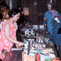 One of the concession tables at Pacific University's annual Lu'au circa 1969-1970. They appear to be selling a variety of knick-knacks and jewelry imported from Hawaii. The concession tables were a special part of the Lu'au: parents of Hawaiian students would help ship flowers, fruit, and other goods via air from the islands to the university in order to sell at this event.