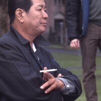 A man, identified on the original slide as "Mr. Yokouchi," outside at Pacific University's annual Lu'au circa 1969-1970. This may be the father of Karen Yokouchi, Pacific University Class of 1972.