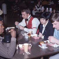 Pacific University students eating dinner during an event on campus. Two of the students are dressed in "Gay Nineties" costumes, possibly indicating that this photograph was taken during the annual Gay Nineties festival that took place in Forest Grove in Spring. Alternatively, the dinner may have taken place during Homecoming weekend in 1970, when the Freshman class hosted a dinner with entertainment.