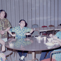 Pacific University students and/or relatives eating at the university's annual Lu'au circa 1969-1970. This photograph was probably taken in the Multi-Purpose Room (MPR) of Washburne Hall.