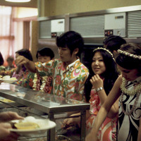 Pacific University students standing in the service line for the buffet at Pacific University's annual Lu'au, circa 1969-1970. A note on the original slide identifies several of the people in the image: Blaine Yata (Class of 1972), Sharon Nonaka (Class of 1974), and Roberta [Klenako?].