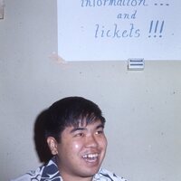 A Pacific University student under a sign advertising tickets for its annual Lu'au circa 1969-1970. The sign reads, "Luau, Information and Tickets!"