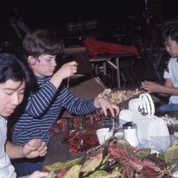 Pacific University students stringing leis and/or decorations made of flowers and leaves during the university's annual Lu'au circa 1969-1970. Students' family members would ship fresh flowers and produce from Hawai'i via air to Oregon to be used at this event.