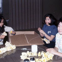 Three female students stringing leis in preparation for one of Pacific University's annual Lu'au celebrations, probably in 1969 or 1970. Leis were used in the performances and were also sold at a concession stand as a fundraiser.