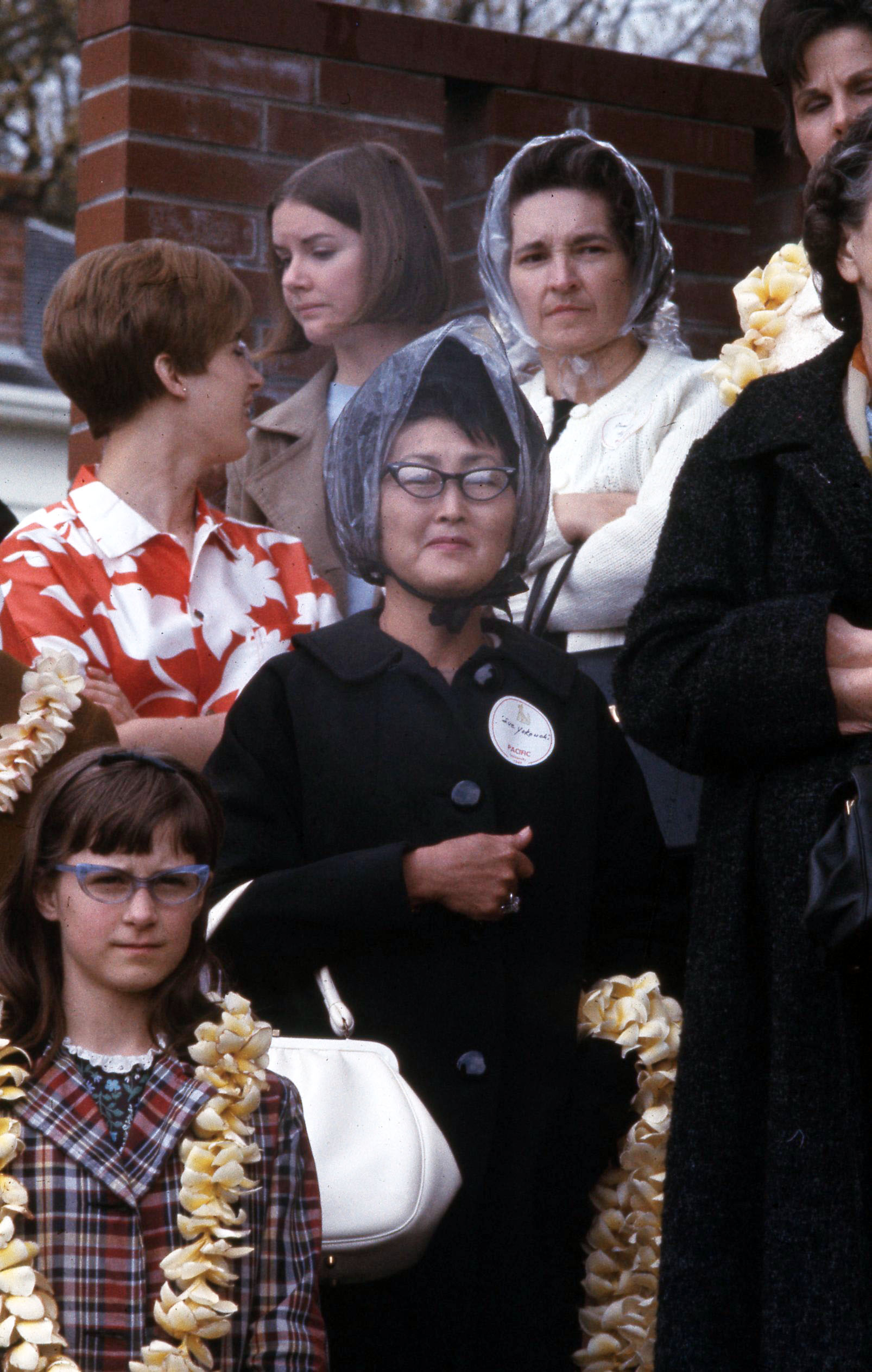 Sue Yokouchi with several other parents and relatives of students getting ready to attend Pacific University's annual Lu'au, circa 1969-1970. Sue Yokouchi was likely the mother of Karen Yokouchi, Pacific University Class of 1972.