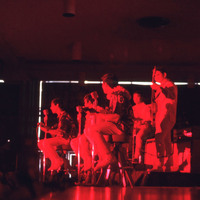 Pacific University students performing music as the band "Lolos," at the university's annual Lu'au, under vividly red stage lighting. This photograph was probably taken in 1969 or 1970.