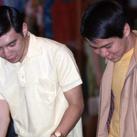 Two Pacific University students, Mike Muraoka (class of 1971) and Everett Ogawa (Class of 1972), at the university's annual Lu'au circa 1969-1970.