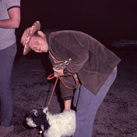 Pacific University student Mike Ben (Class of 1971), wearing a hat and holding the leash for a small dog. This photograph likely dates from circa 1970 and may have been taken at a Hawaiian Club event.