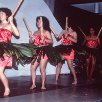 Four women students performing a dance with pu'ili sticks at Pacific University's annual Lu'au in 1985.