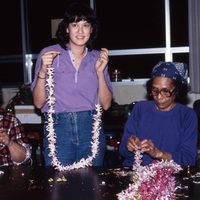 A student and two older women, possibly relatives, stringing orchid leis before Pacific University's annual Lu'au in 1983.
