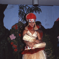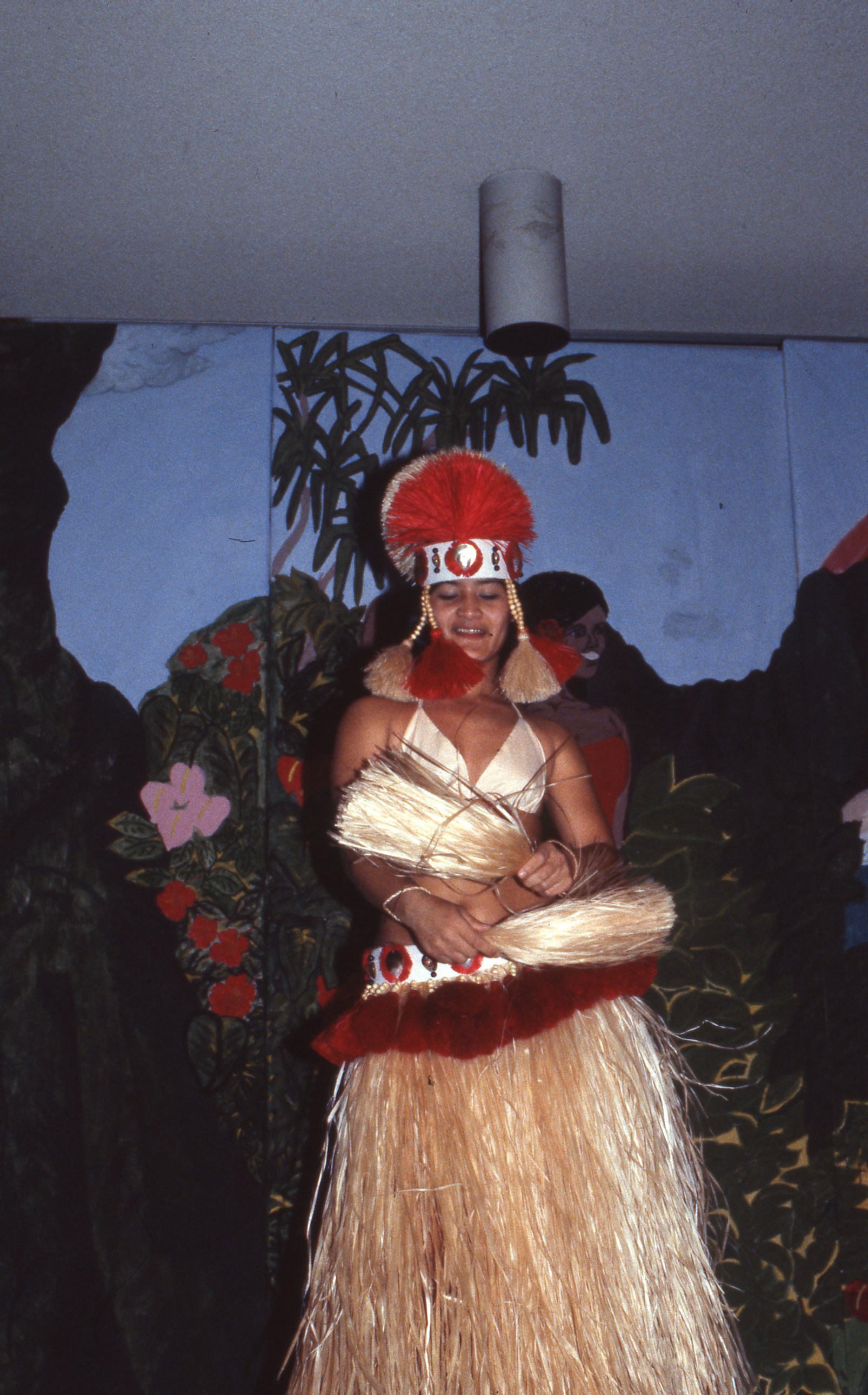 A woman performs a Tahitian-style dance on stage at Pacific University's annual Lu'au in 1982. She is wearing a tasseled grass skirt and headress, and is holding grass hand tassels.