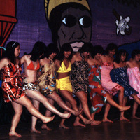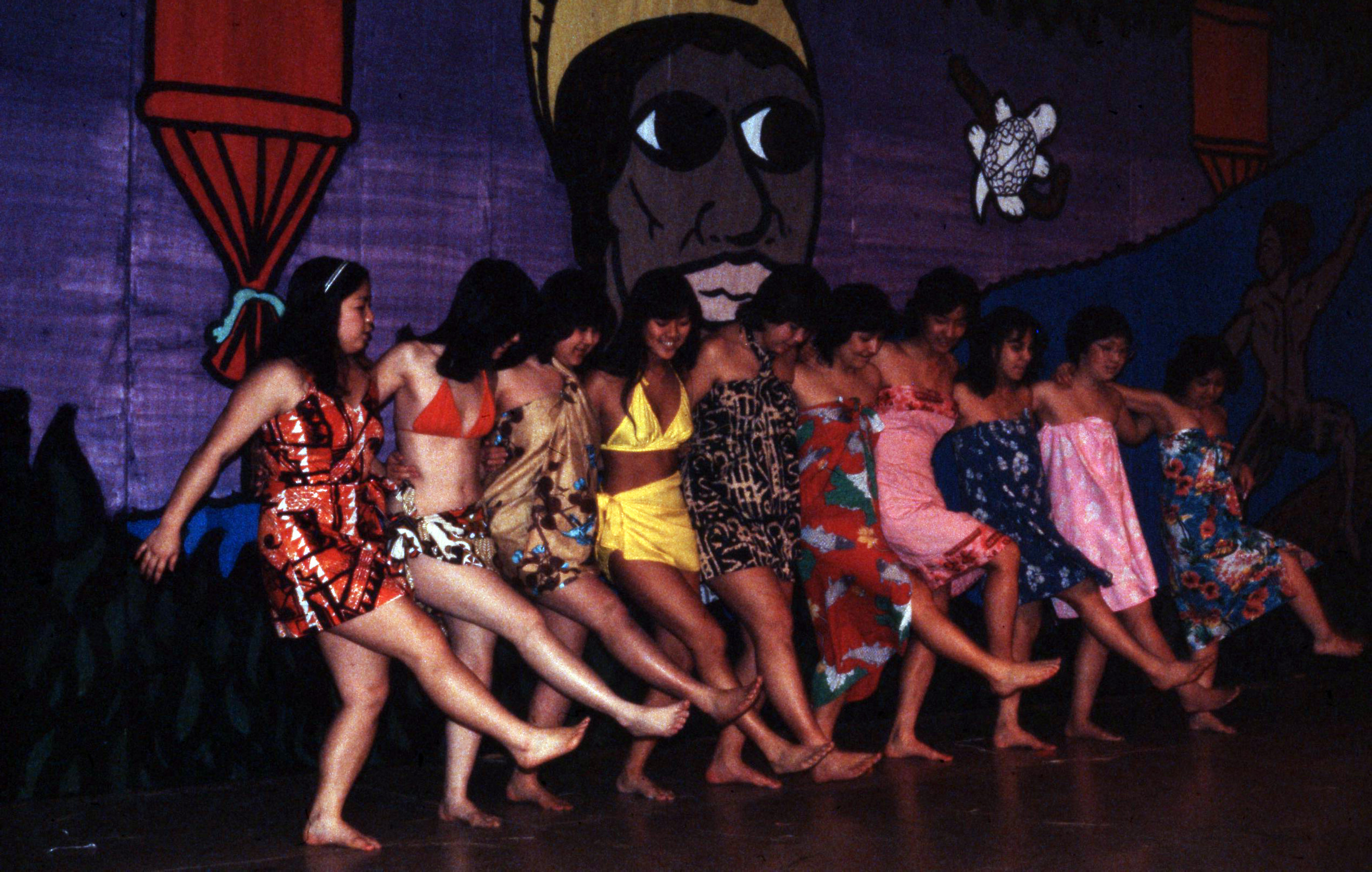 A line of women dancers, performing on stage at Pacific University's annual Lu'au in 1981.