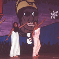 A line of women dancers wearing long, light-colored dresses, performing the hula on stage at Pacific University's annual Lu'au in 1981.