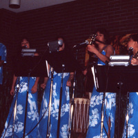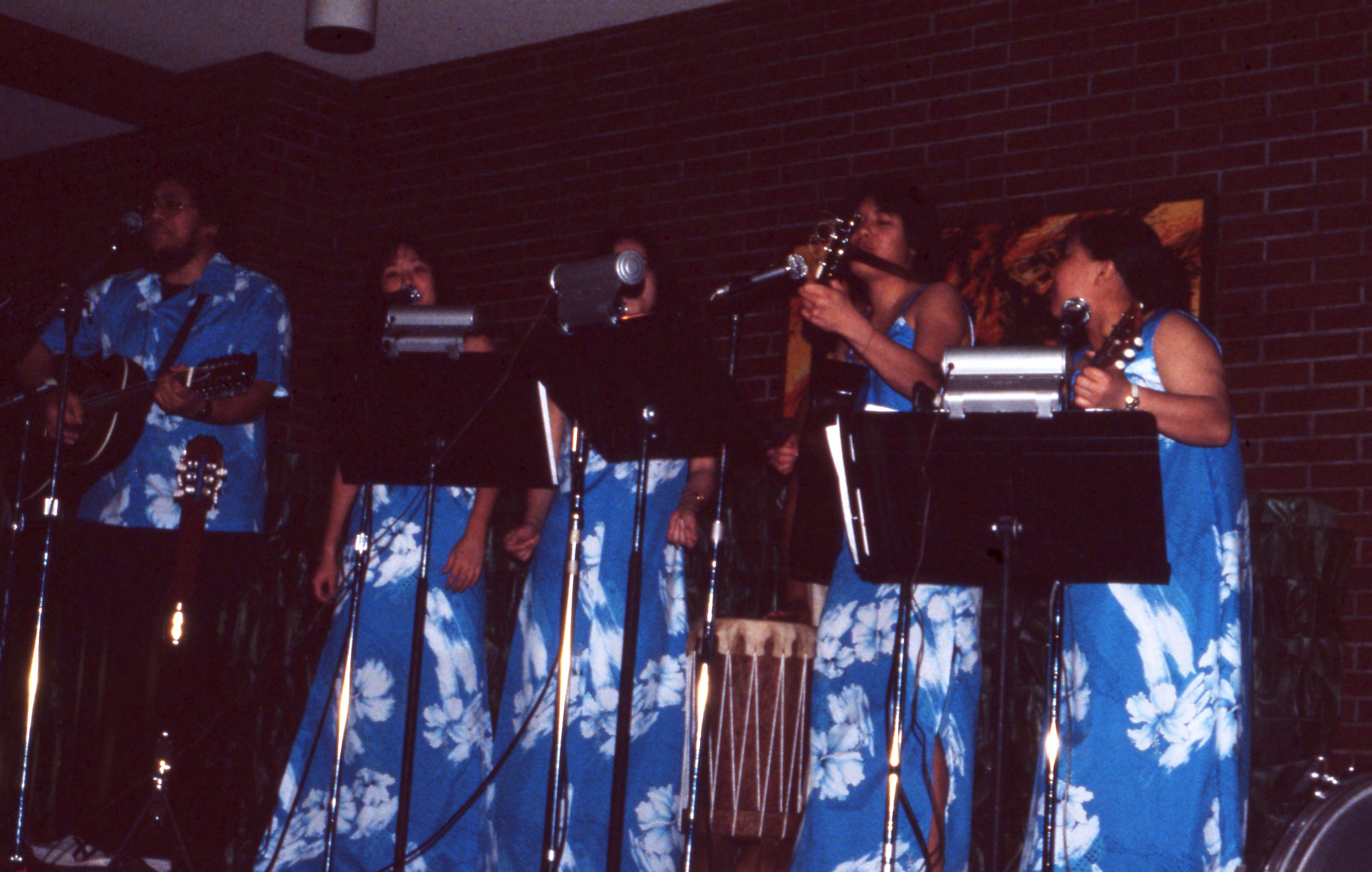 Four women and one man sing and play music on stage at Pacific University's annual Lu'au in 1981. They are wearing matching blue and white printed clothing.