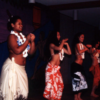 A line of women dancers wearing pareo (sarongs), bikini tops and leis, at Pacific University's annual Lu'au in 1981.