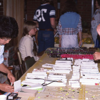 A vendor selling beaded jewelry at Pacific University's annual Lu'au in 1978. Other vendors, who may be selling leis, mangoes and other goods, are visible in the background.