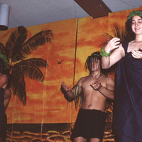 A group of student dancers performing on stage in black outfits, at Pacific University's annual Lu'au in 1978.
