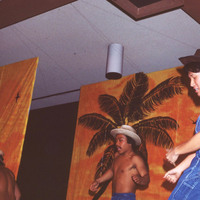 A group of student dancers performing on stage in overalls, at Pacific University's annual Lu'au in 1978.