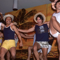 A group of male performers wearing casual clothing, dancing in an exaggeratedly silly way on stage at Pacific University's annual Lu'au in 1978.