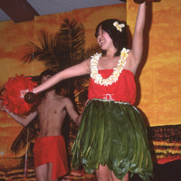 A female dancer wearing a ti leaf skirt and carrying 'uli'uli (feathered rattles), on stage at Pacific University's annual Lu'au in 1978. A male dancer wearing a malo is in the background.