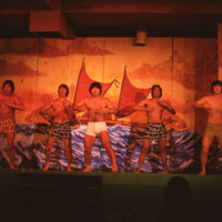 A group of five male Pacific University students, each wearing shorts and/or a malo, performing a dance at the university's annual Lu'au in 1977. The backdrop depicts a catamaran sailing on the ocean.