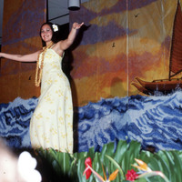 A female dancer wearing a yellow dress, performing on stage at Pacific University's annual Lu'au in 1977.