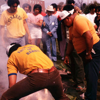 Men wearing matching t-shirts tend the pit where a kalua pig is being roasted for Pacific University's annual Lu'au in 1977. The men are likely either Pacific University students or students' family members from Hawai'i. Their shirts read "Punahou," which is the name of a private school in Honolulu.