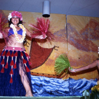 Two women students from Pacific University perform a Tahitian-style dance at the university's annual Lu'au in 1977. The original slide is labeled "Yanigitani," which may be the name of one of the performers, or may be the name of the photographer. The dancers holding hand tassels and wearing tasseled grass skirts.